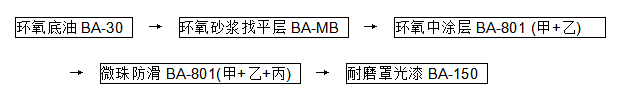 施工流程:材料說明:施工步驟說明:1.涂環氧底油:涂BA-30#。2.砂漿找平層: BA-MB將基底進行找平。(視現場地坪實際情況而定)。3.環氧中涂層:先用帶顏色的BA-801(甲乙組份)刮涂一遍,薄刮,滿刮均勻,不漏底即可,待干。(注:中間這一層不需要加 微珠材料。)4.微珠防滑層:再用帶顏色的 BA-801(甲乙組份)+ 丙組份(微珠),攪勻,薄刮一遍,一邊刮涂,一邊用羊毛滾筒收涂至均一的微珠效果為止。5.罩光層:在微珠防滑面上施...