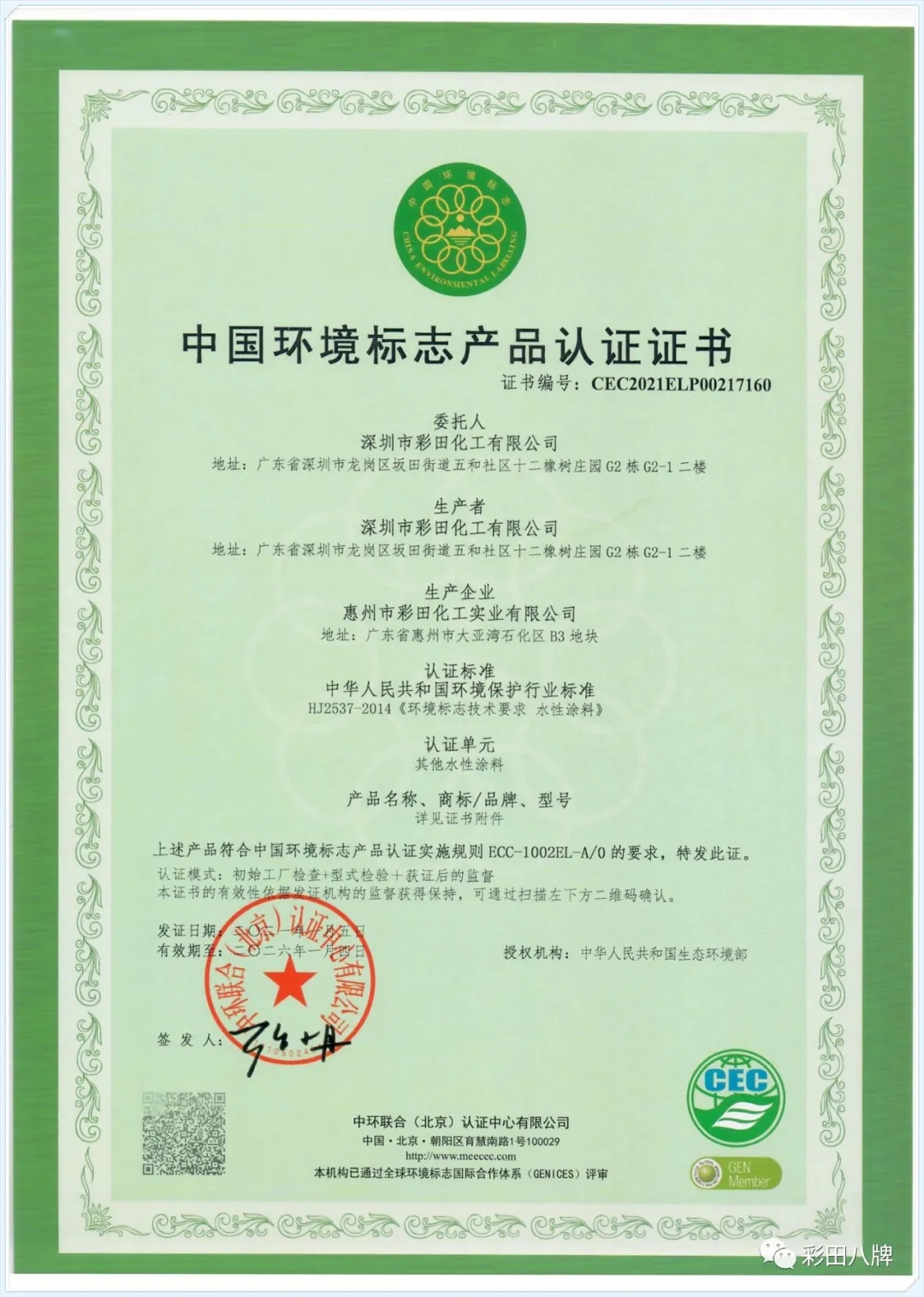 環(huán)保先行者|彩田榮獲中國環(huán)境標(biāo)志認證(十環(huán)認證)