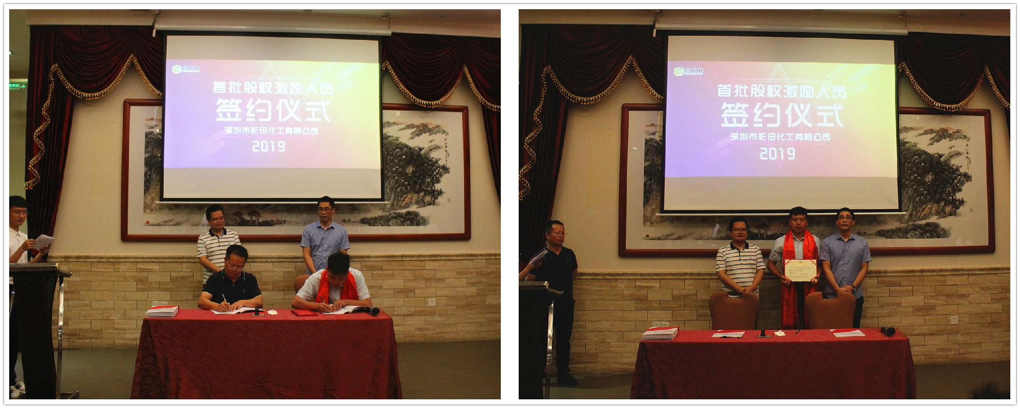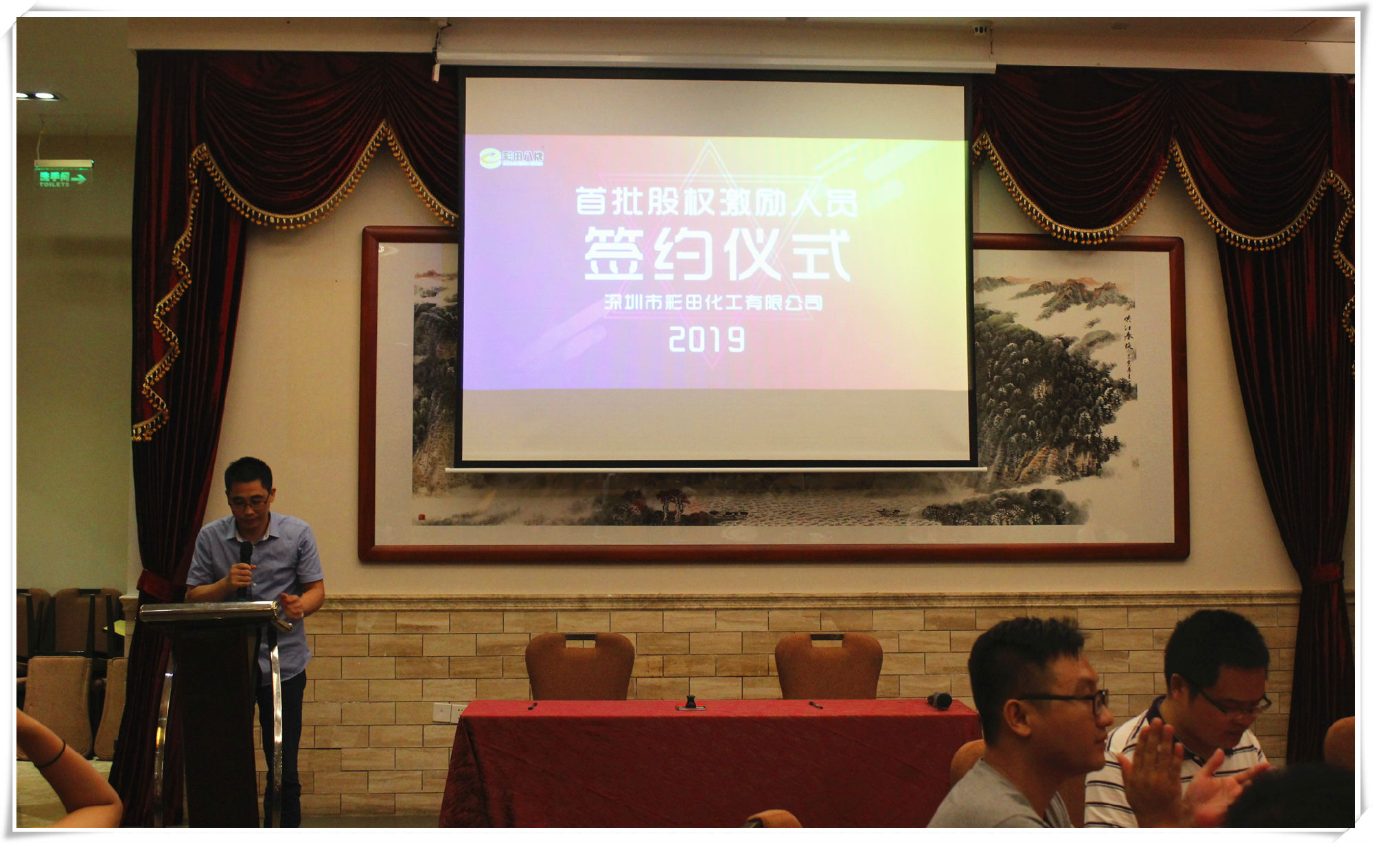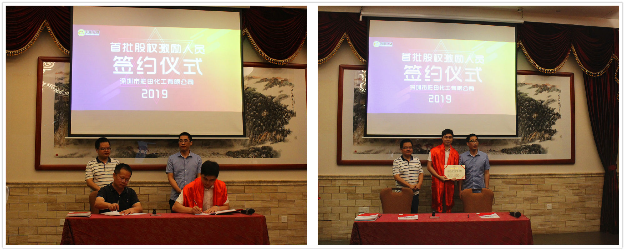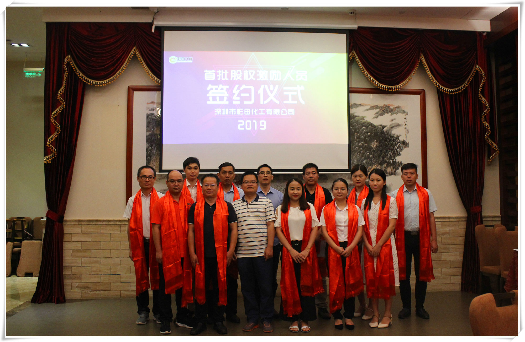 2019年7月20日18:20,深圳市彩田化工有限公司首批股權(quán)激勵人員簽約儀式在清遠國際酒店宴會廳隆重舉行!公司全體人員及家屬代表匯聚一堂,共同見證了這一重要的、具有里程碑意義的篇章