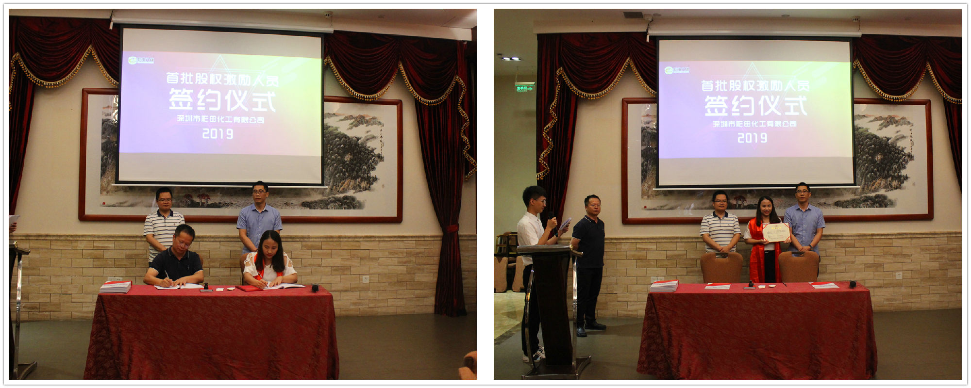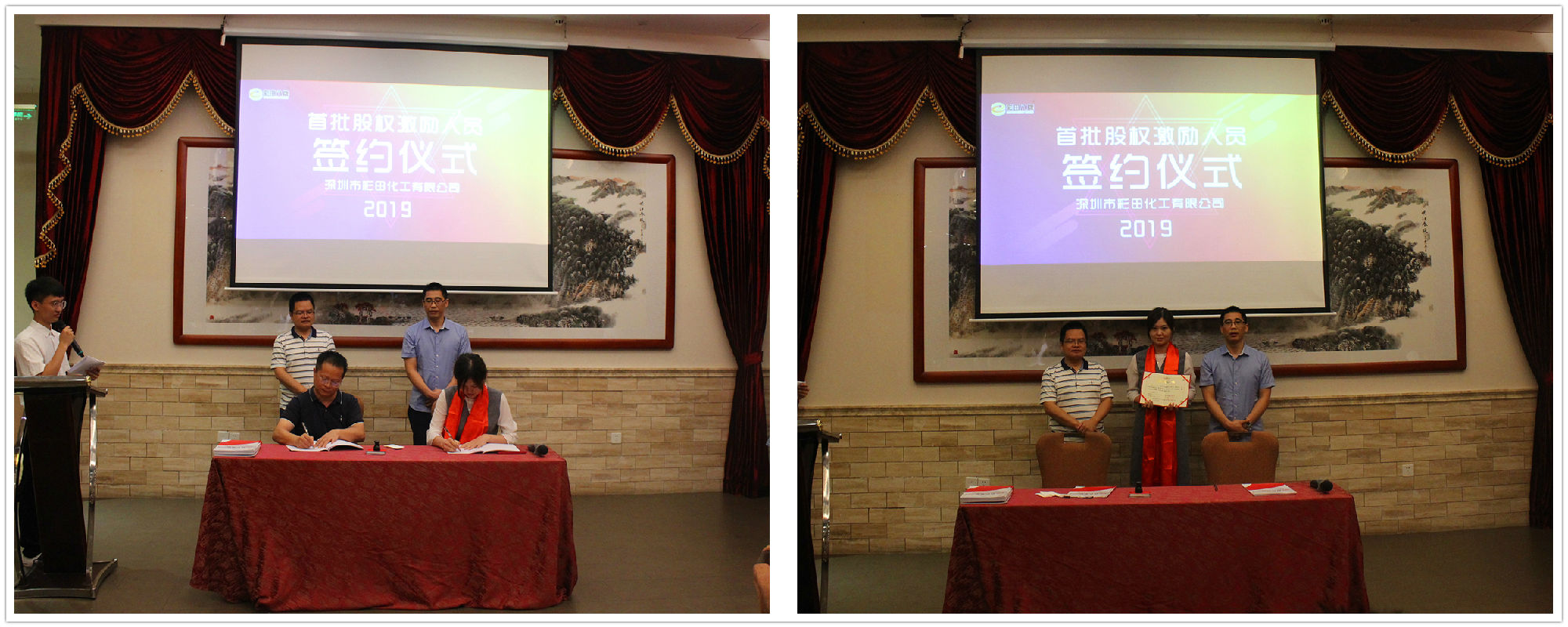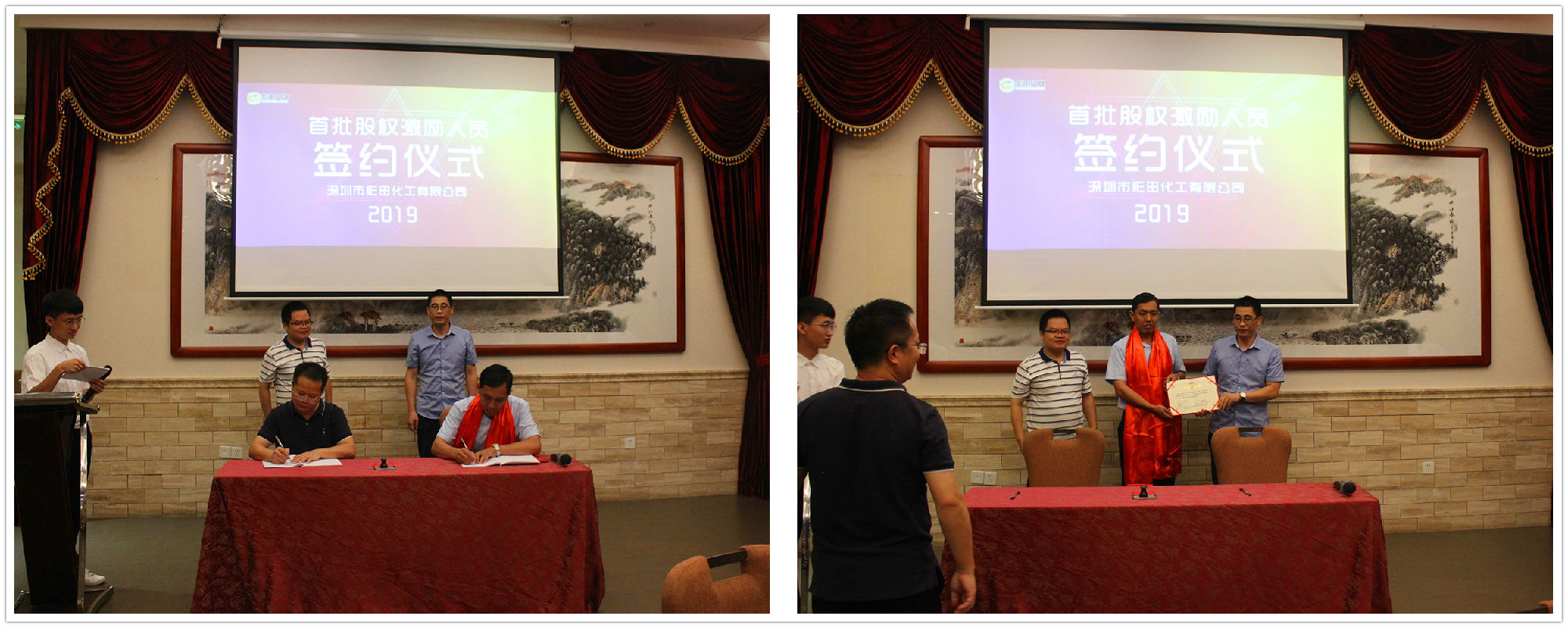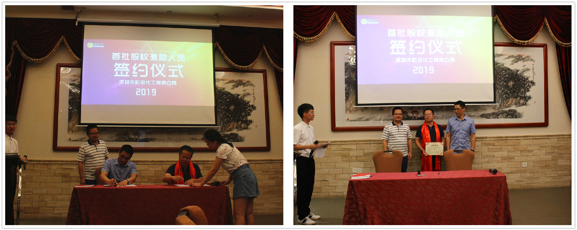 2019年7月20日18:20,深圳市彩田化工有限公司首批股權(quán)激勵人員簽約儀式在清遠國際酒店宴會廳隆重舉行!公司全體人員及家屬代表匯聚一堂,共同見證了這一重要的、具有里程碑意義的篇章