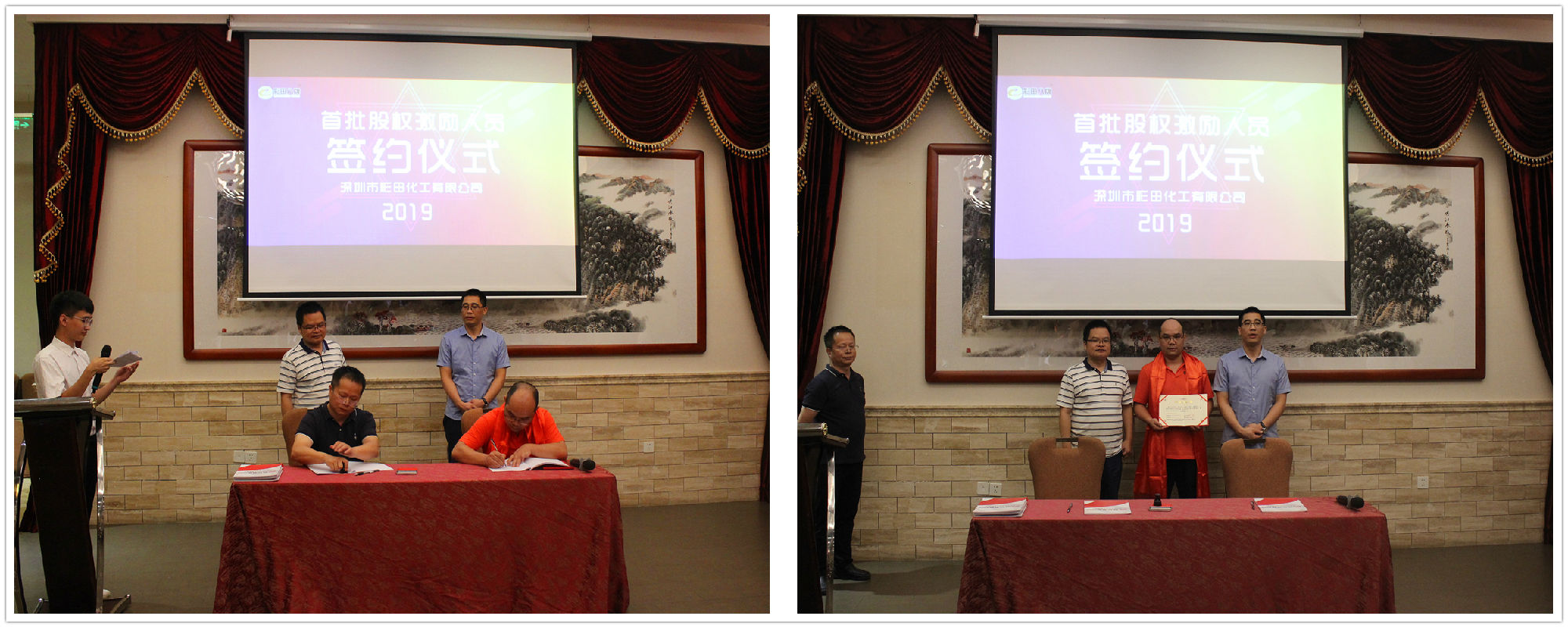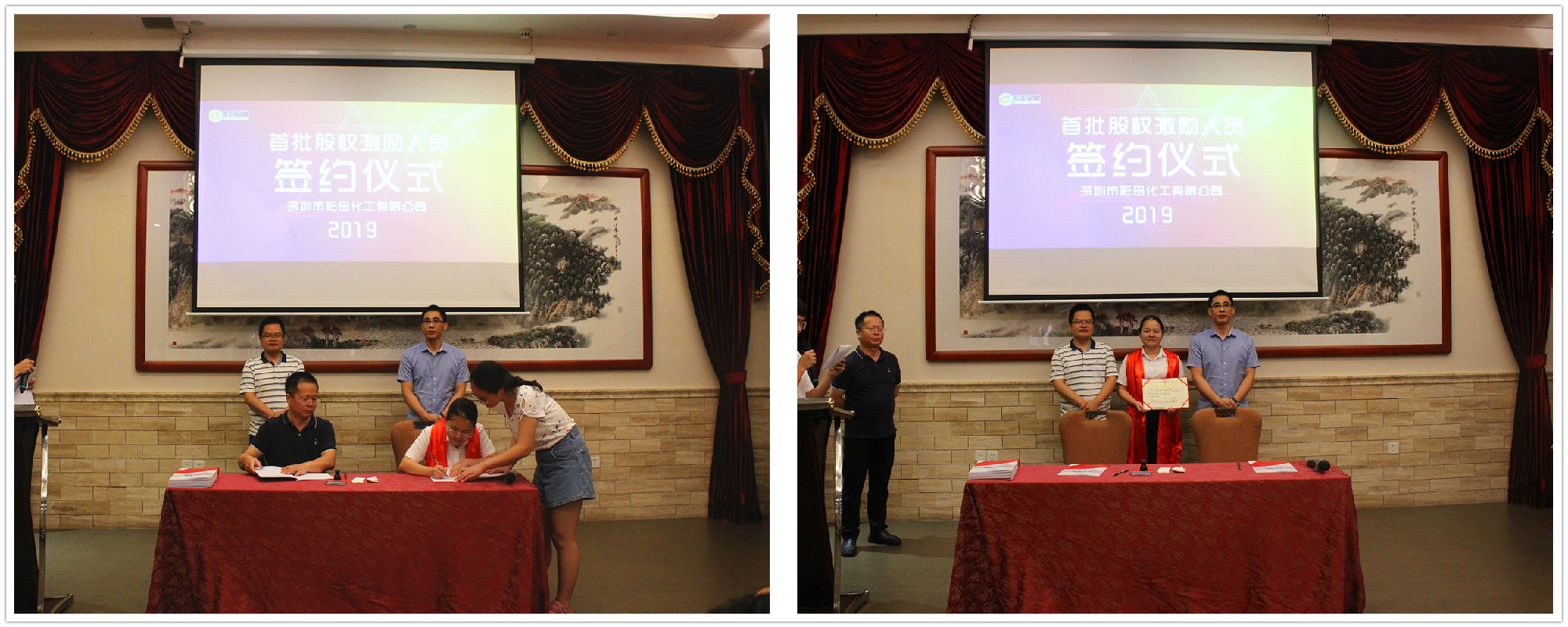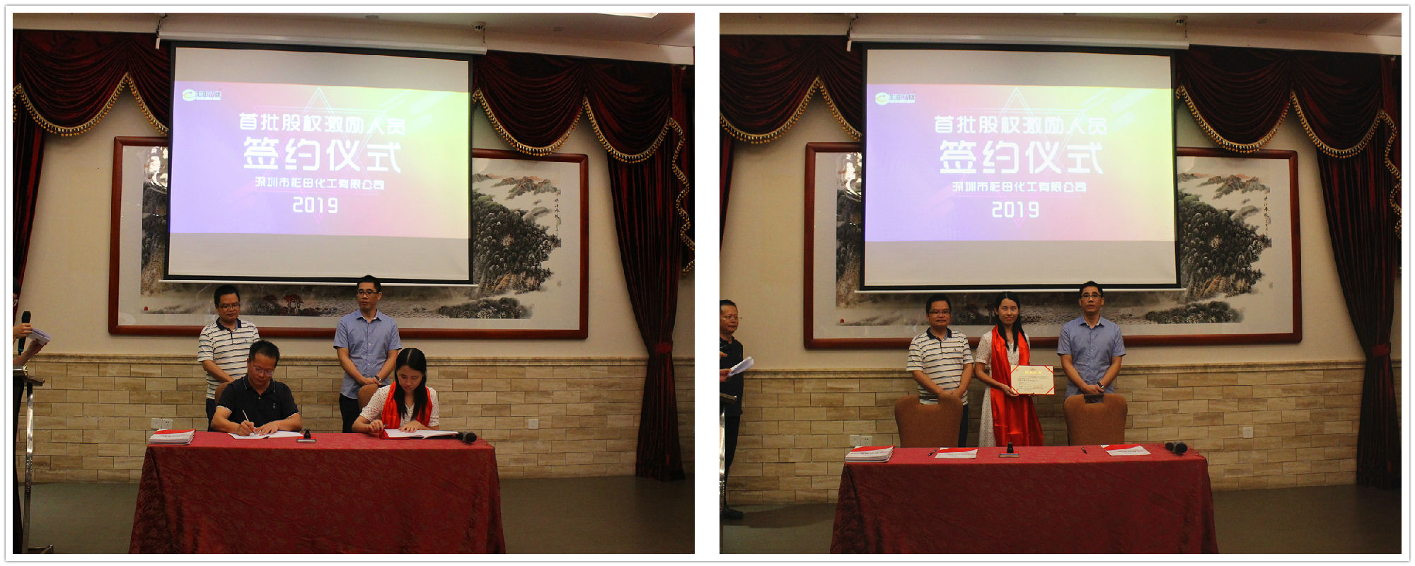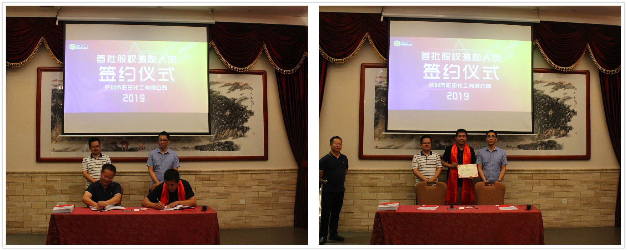 2019年7月20日18:20,深圳市彩田化工有限公司首批股權(quán)激勵人員簽約儀式在清遠國際酒店宴會廳隆重舉行!公司全體人員及家屬代表匯聚一堂,共同見證了這一重要的、具有里程碑意義的篇章