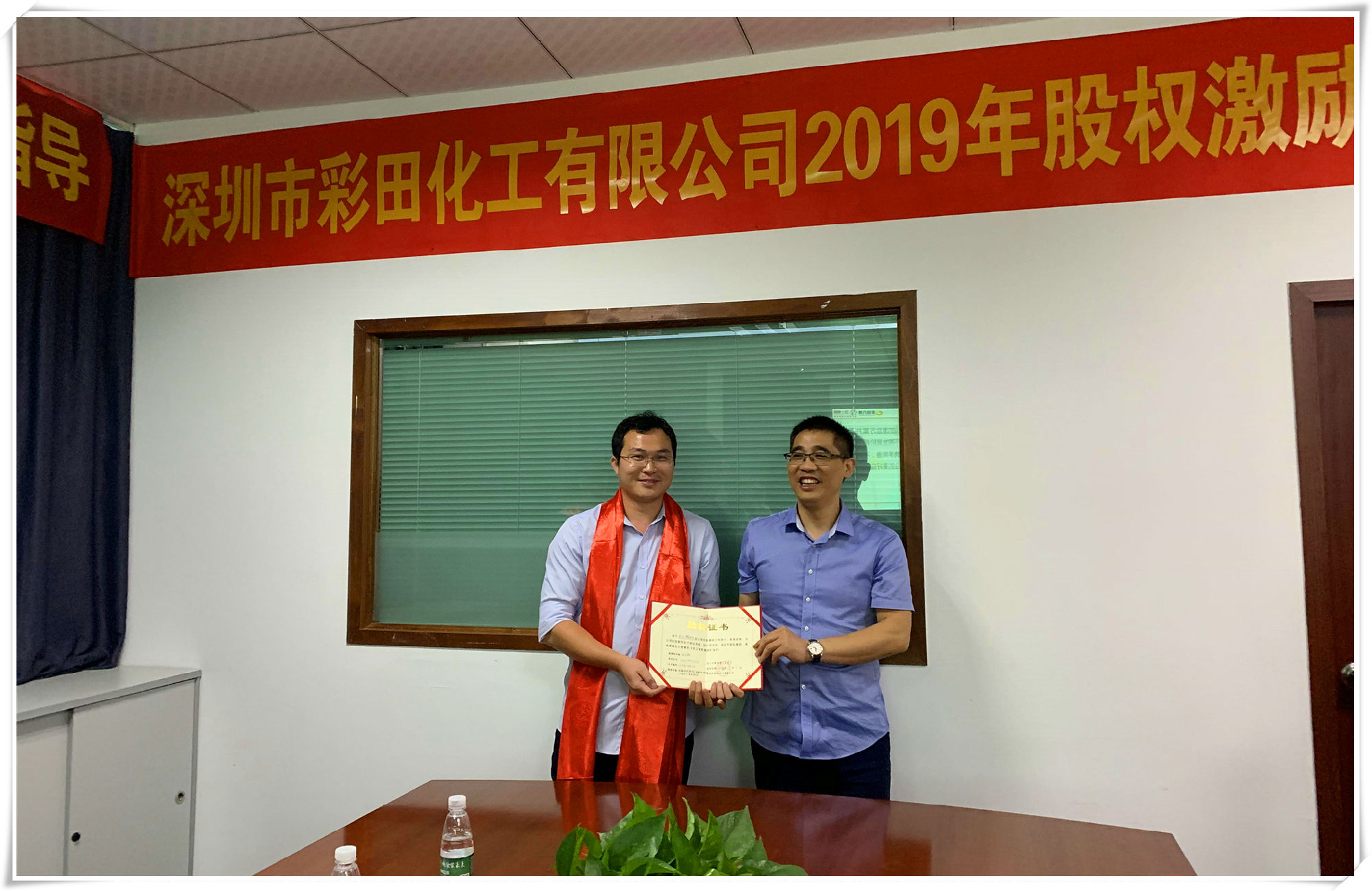 簽約儀式正式開始,由深圳市彩田化工有限公司法人肖建軍依次與本次首批股權(quán)激勵人員簽署股權(quán)激勵協(xié)議書,并由彩田化工總經(jīng)理全偉頒發(fā)紅本股權(quán)證書,彩田化工制造部總經(jīng)理聶朝陽親切的獻上哈達,并依次與股權(quán)激勵人員合影留念。