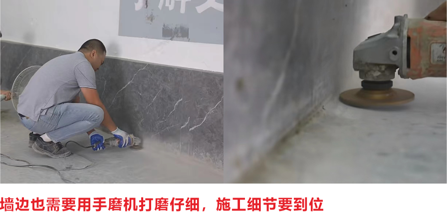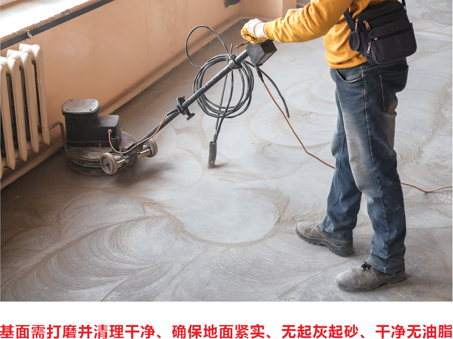 基層處理與完成地坪質(zhì)量密切相關(guān)。使用專業(yè)的無塵混凝土研機和手提磨機進行表面處理,清除地面上舊的涂層,需要的區(qū)域可采用銑刨機、拋丸機進行處理。