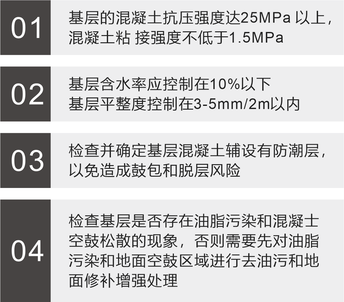 要求: 清除舊地坪,去除松散結(jié)構(gòu),提供粗糙、清潔、堅實的基層。如果基層有空鼓、開裂現(xiàn)象,則需要鑿除、切割并修理找平。對于新混凝土基層要求水泥標號達C25以上,砼養(yǎng)護15天以上。