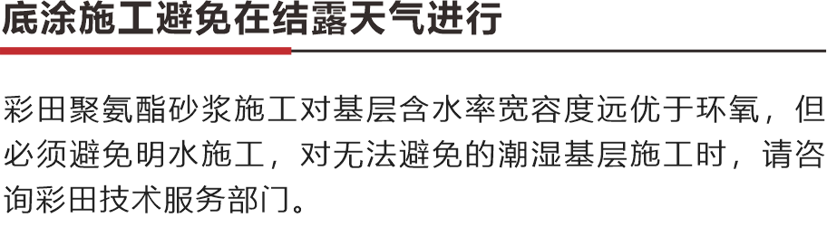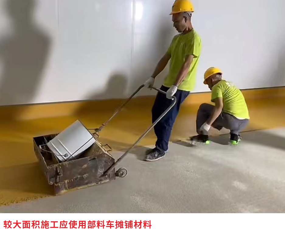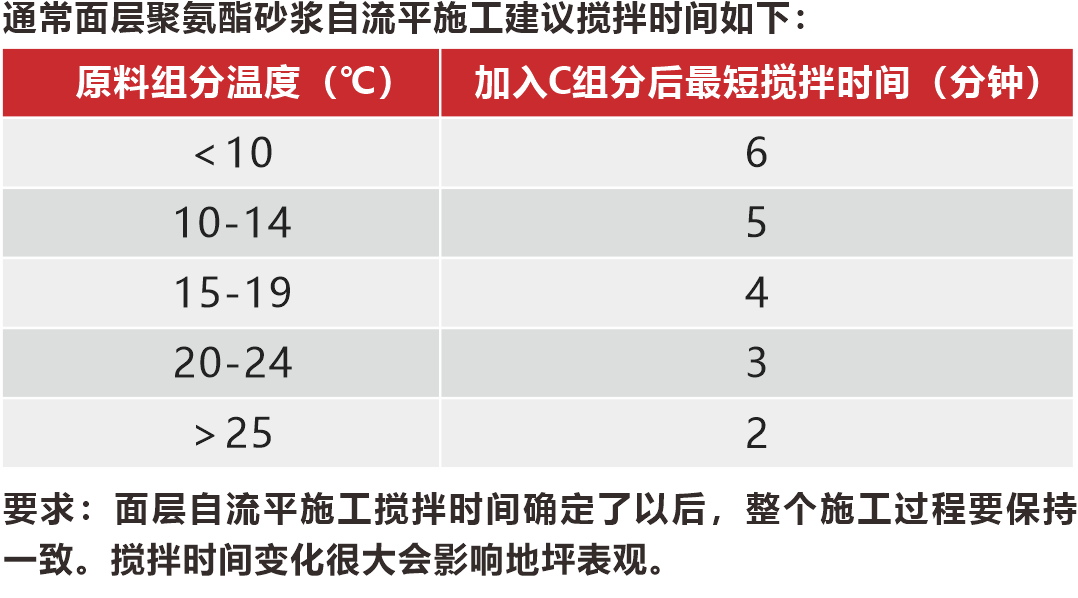 面層施工避免在結(jié)露天氣進行。材料的最佳使用溫度為15℃-30℃,必須使用機械混合。