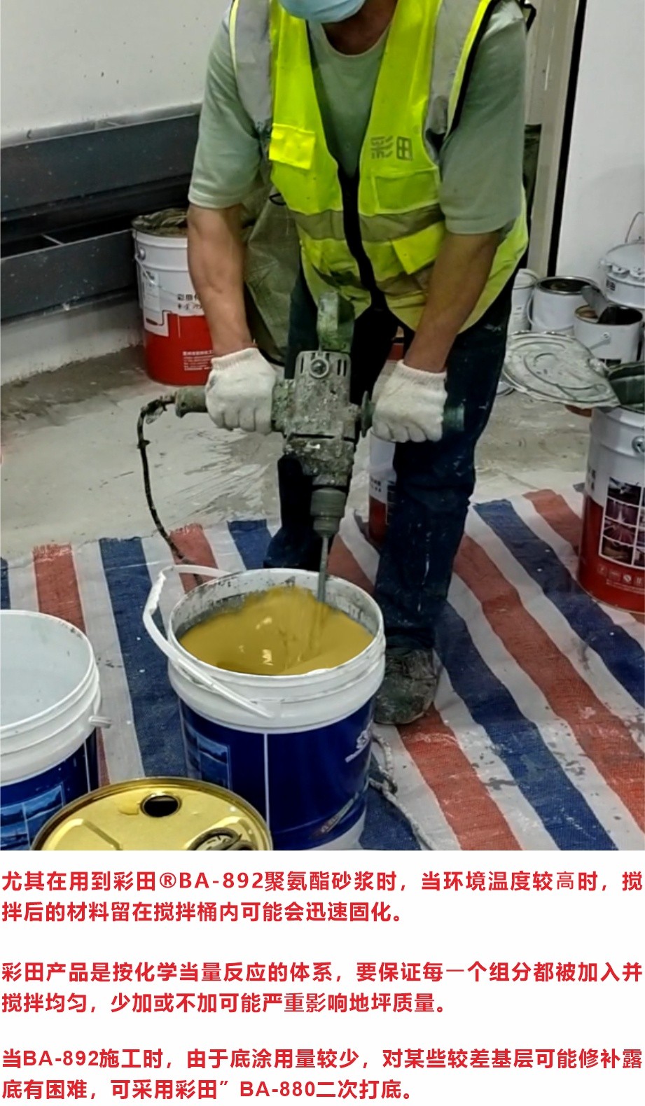 4) 逐漸加入C組分,同時繼續(xù)攪拌,直到混合均勻,沒有聚集顆粒,一般需2分鐘。彩田產(chǎn)品是按化學當量反應(yīng)的體系,要保證每?個組分都被加?并攪拌均勻,少加或不加可能嚴重影響地坪質(zhì)量。