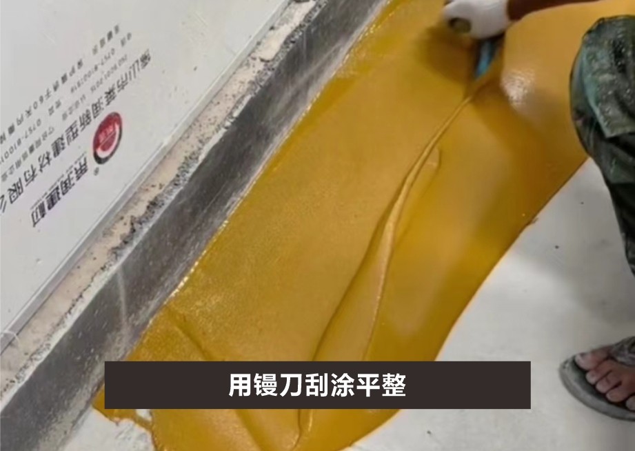攪拌完成后,立刻運到現(xiàn)場倒在待施工表面(待施工表面溫度8℃以上),使用耙子或鏝刀將材料鋪攤成均勻的目標厚度,并立刻使用消泡滾筒以十字交叉方式對材料進行消泡一到二次。