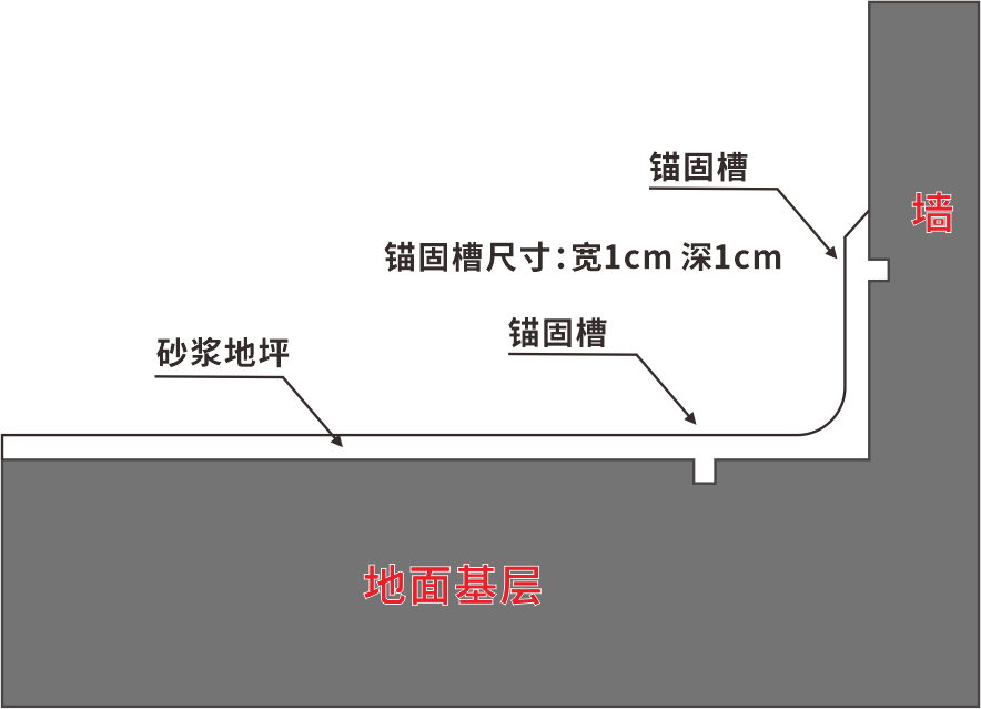 在門口、柱子、設(shè)備基座、地坪開放邊界、基層混凝土施工縫和誘導(dǎo)伸縮縫兩邊、將來任何聚氨酯砂漿面層需切割伸縮縫的兩邊、以及面層需分區(qū)施工的界線的兩邊也須按此法預(yù)先切割錨固槽。錨固槽切割圖示范如右圖。