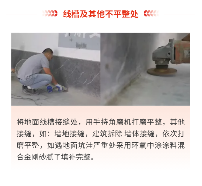 清除地面表面的浮漿,使地面與底涂增加附著力,采用自吸塵打磨機將所有施工面全部打磨平整毛糙,使環氧底涂能與水泥地面更好的粘合。