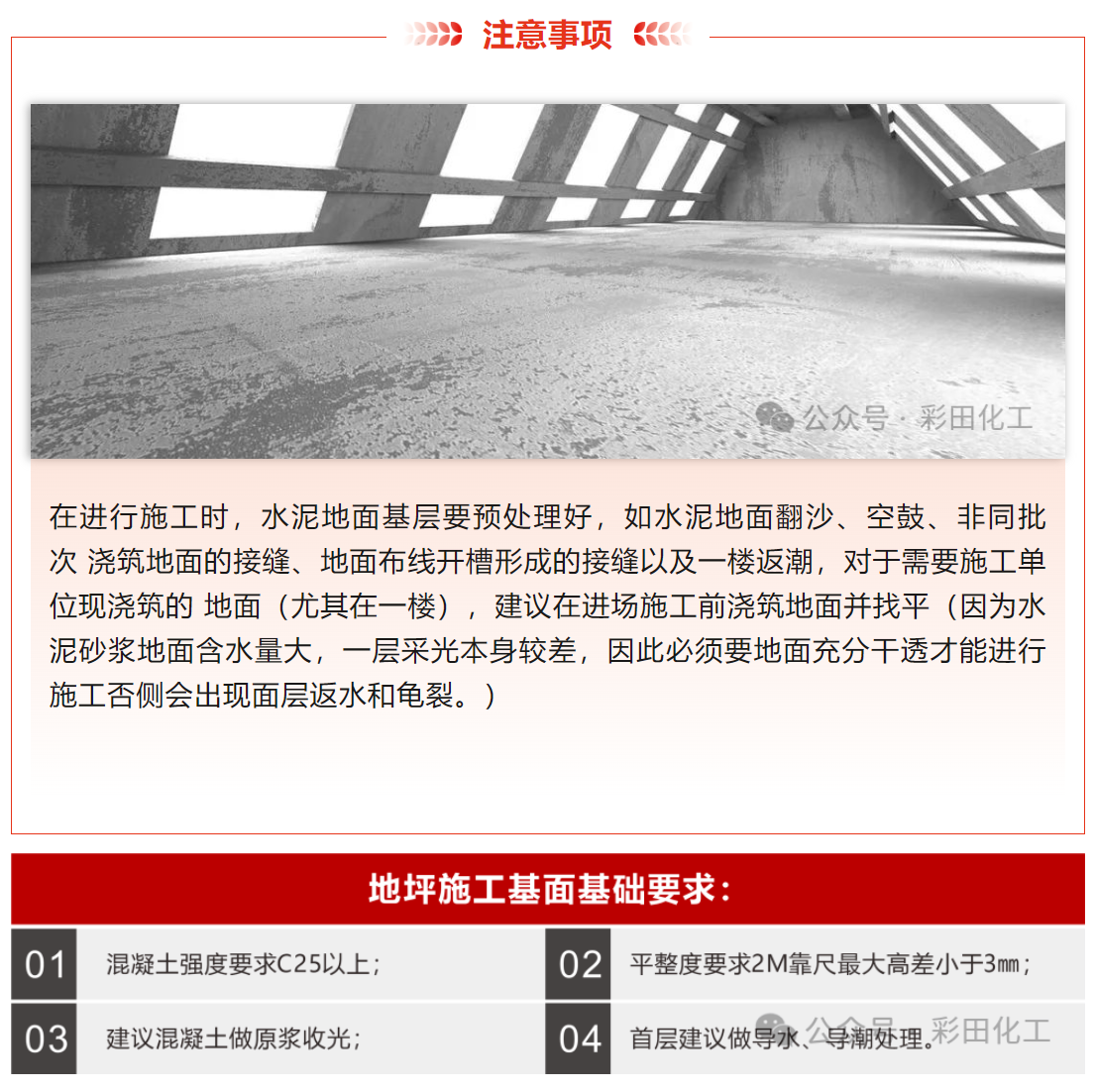 1)涂刷彩田? BA-30W環氧底油,使其充分滲入地面,達到表面成膜為準,要求均勻無遺漏;