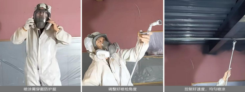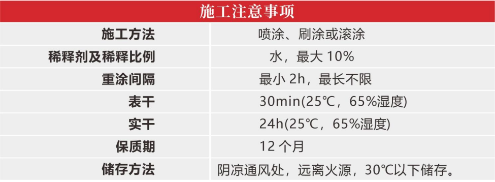 4、施工注意事項:雨天或過度潮濕天氣禁止施工,保持施工環境的空氣流通;過度加水稀釋會增加涂裝風險,并容易產生遮蓋力不足、漆膜不夠豐滿等問題,最終會降低涂膜 綜合性能,所以一次成膜不能太厚,建議單遍干膜厚度為30μm。