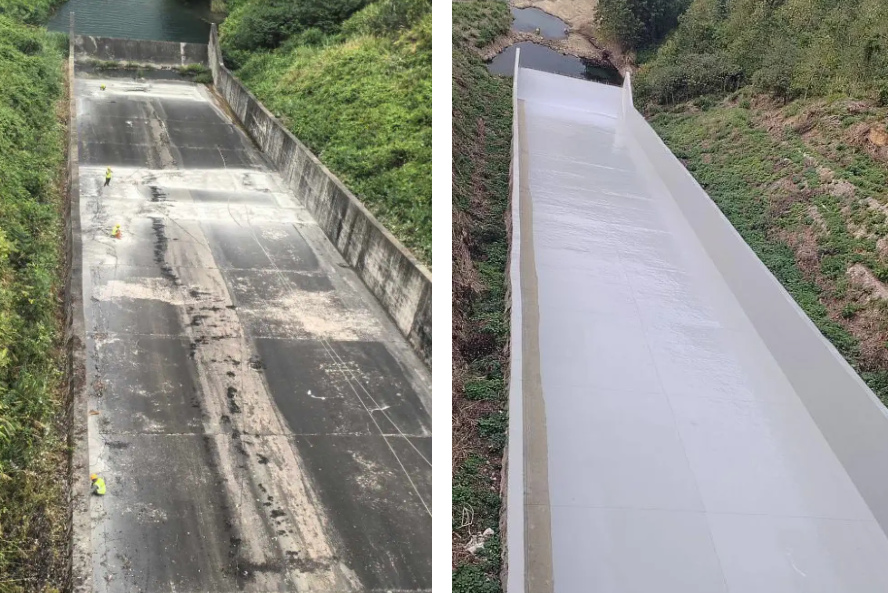 對基面打磨清理后使用彩田新型快速修復抗沖磨材料進行修復找平(施工厚度3mm),后涂刷1mm氟改性高聚物降糙防護涂料進行表面防護處理。