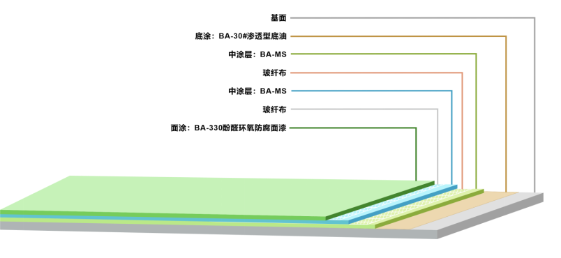 玻纖層:用環(huán)氧樹脂滾涂底涂層,鋪設玻纖布,輥壓至完全浸潤、密實。可重復此工藝厚度要求。參考用量0.2-0. 5kg/m2;