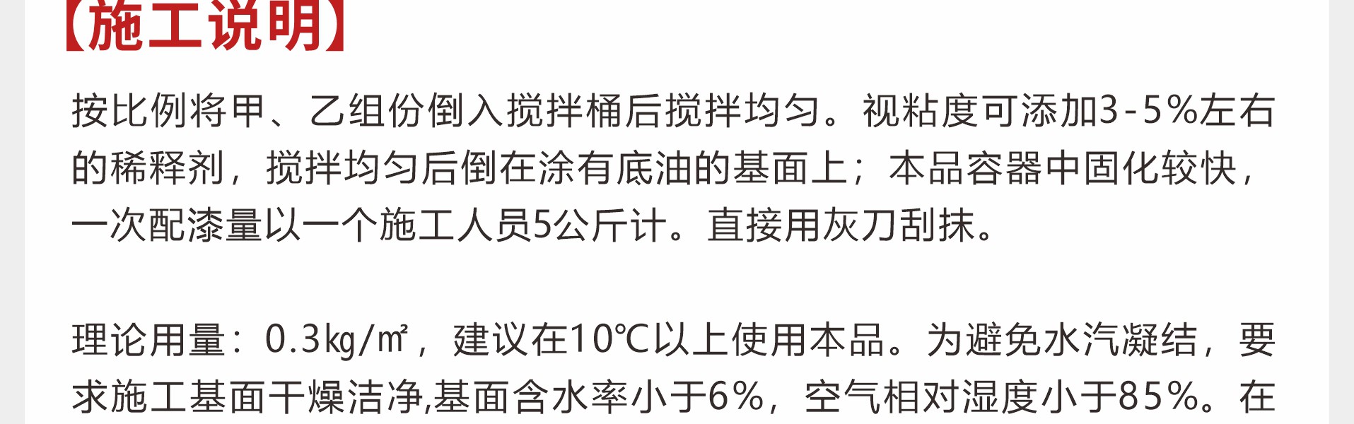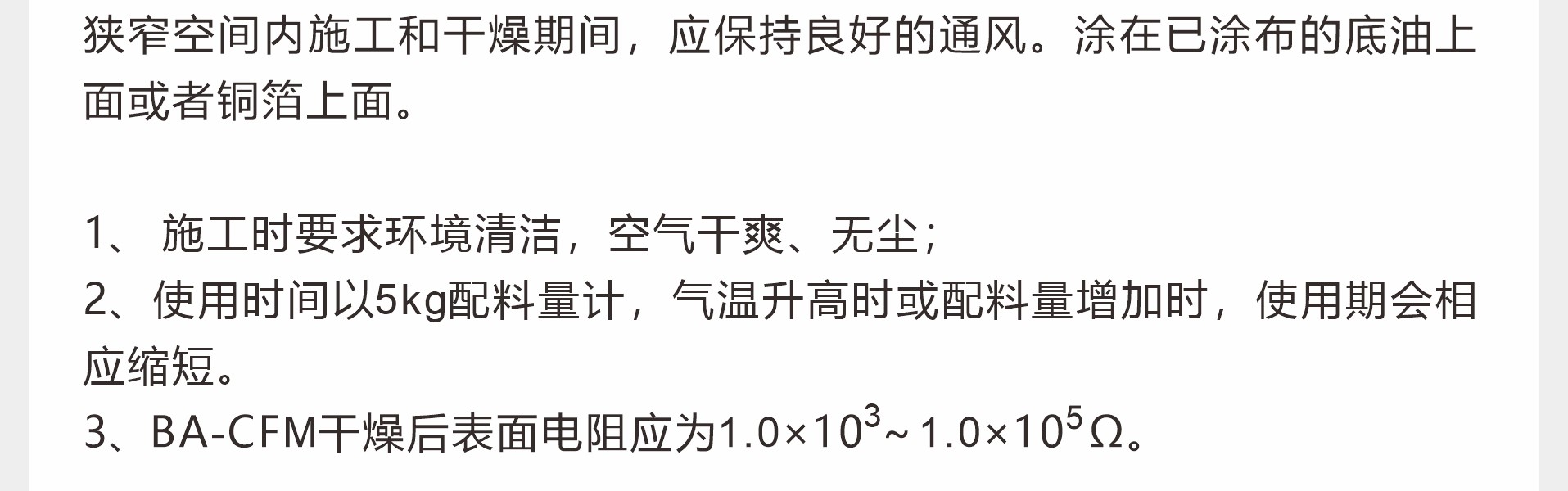 概述:彩田BA-CFM高固含環氧防靜電中涂是一種常溫固化雙組份無溶劑型環氧樹脂漆。特性:1、無溶劑、環保型;2、良好的導電性。用途:1、調配石英粉成環氧膩子,提高地板涂料的強度、平整度和導電性;2、防靜電地坪工程中用來封閉銅箔。物理參數:施工說明:混合:按比例將甲、乙組份倒入攪拌桶后攪拌均勻。視粘度可添加3-5%左右的稀釋劑,攪拌均勻后倒在涂有底油的基面上。施工方法:本品容器中固化較快,一次配漆量以一個施工...