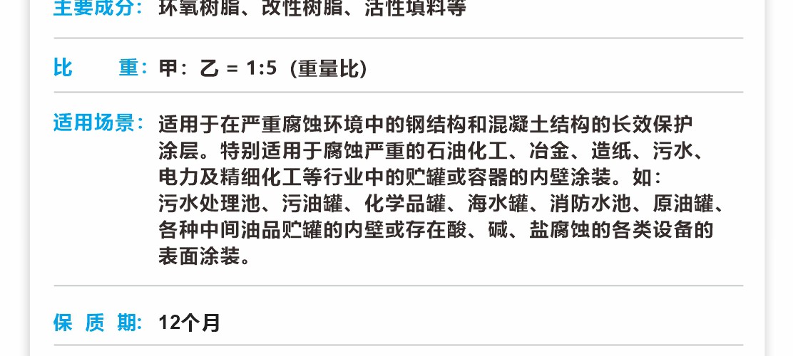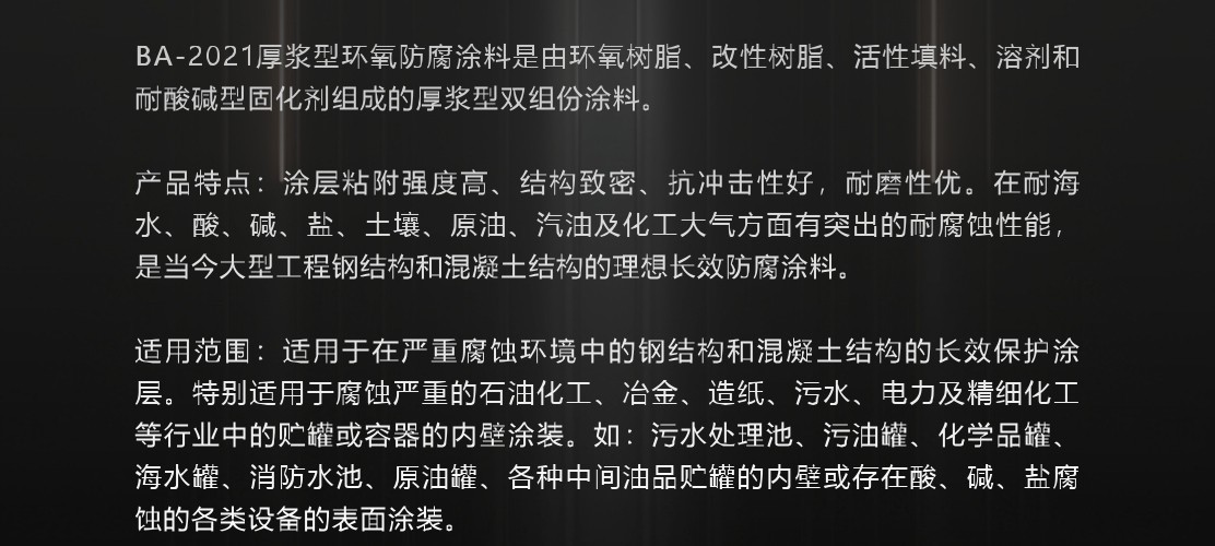 彩天化工 | 厚漿型環(huán)氧防腐涂料是由環(huán)氧樹(shù)脂、改性樹(shù)脂、活性填料、溶劑和耐酸堿型固化劑組成的厚漿型雙組份涂料。 產(chǎn)品特點(diǎn):涂層粘附強(qiáng)度高、結(jié)構(gòu)致密、抗沖擊性好,耐磨性優(yōu)。在耐海水、酸、堿、鹽、土壤、原油、汽油及化工大氣方面有突出的耐腐蝕性能,是當(dāng)今大型工程鋼結(jié)構(gòu)和混凝土結(jié)構(gòu)的理想長(zhǎng)效防腐涂料。 適用范圍:適用于在嚴(yán)重腐蝕環(huán)境中的鋼結(jié)構(gòu)和混凝土結(jié)構(gòu)的長(zhǎng)效保護(hù)涂層。特別適用于腐蝕嚴(yán)重的石油化工、冶金、造紙、污水、電力及精細(xì)化工等行業(yè)中的貯罐或容器的內(nèi)壁涂裝。如:污水處理池、污油罐、化學(xué)品罐、海水罐、消防水池、原油罐、各種中間油品貯罐的內(nèi)壁或存在酸、堿、鹽腐蝕的各類設(shè)備的表面涂裝。