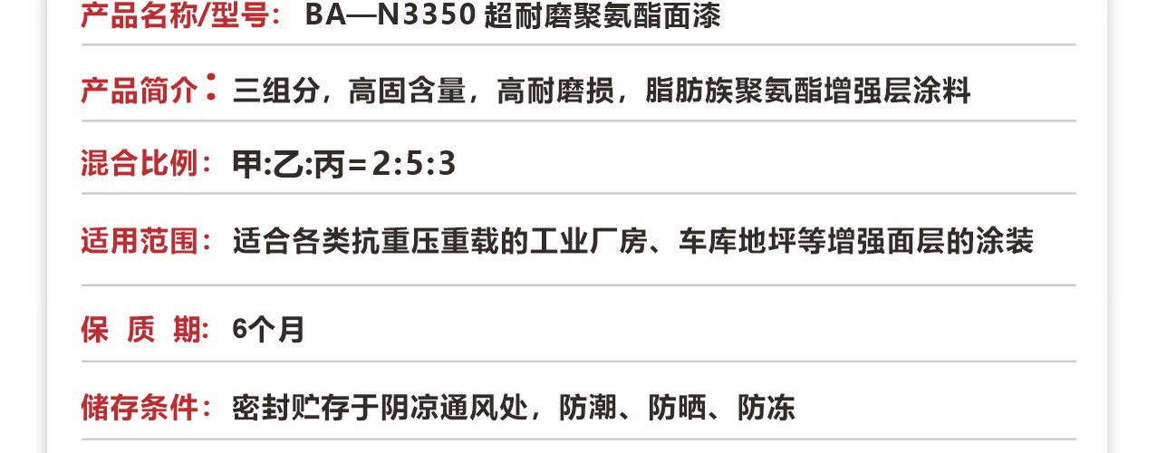 超耐磨聚氨酯面漆 是三組份,高固含量,高耐磨損,脂肪族聚氨酯增強層涂料 特性:高固含量,優(yōu)異的耐磨損,抗沖擊性能,優(yōu)異的耐黃變性能,可獲得紋理表面,很好的抗化學(xué)性能。