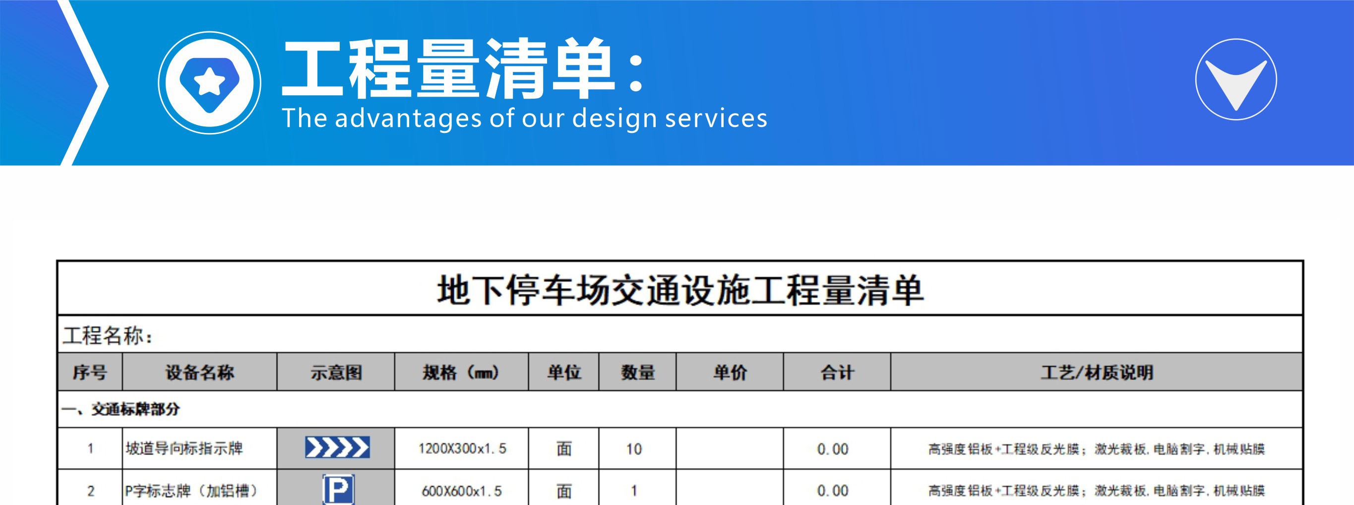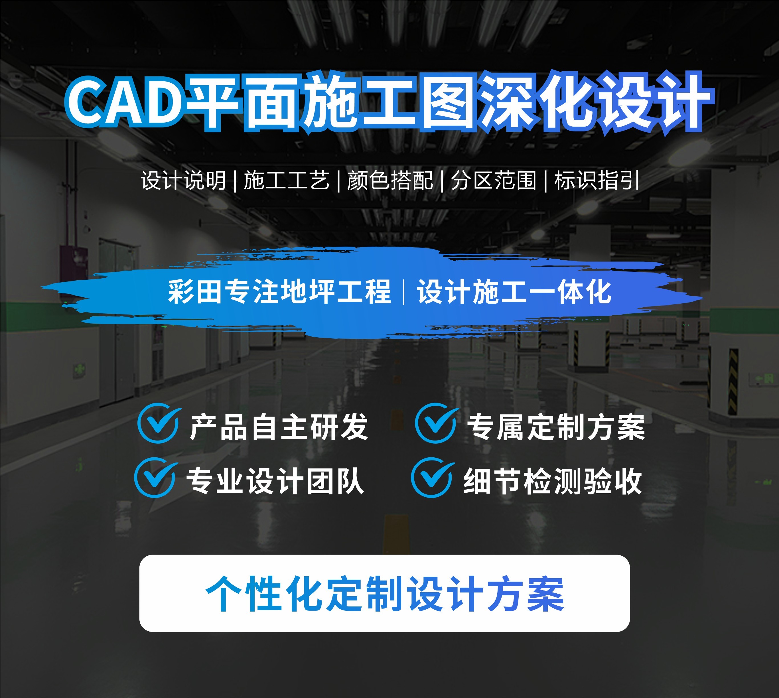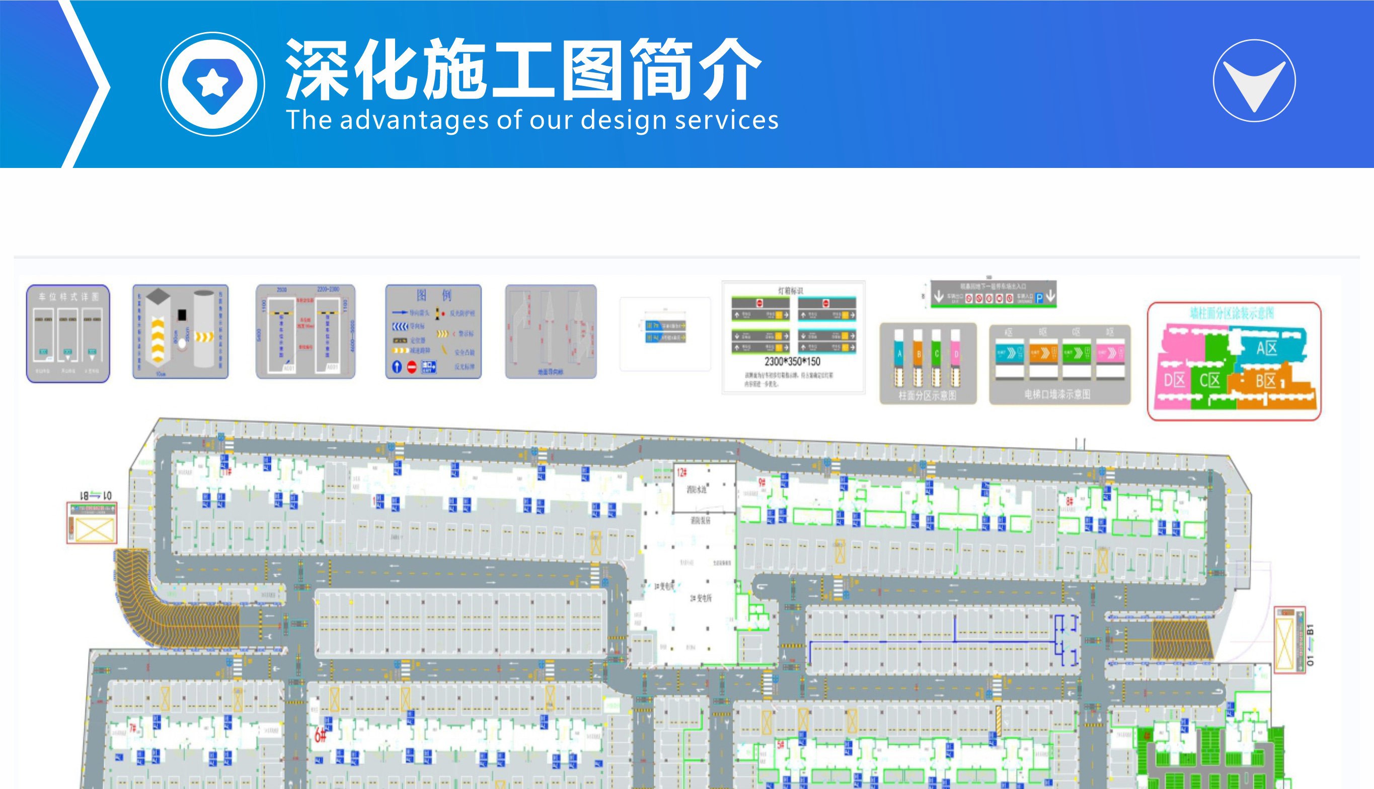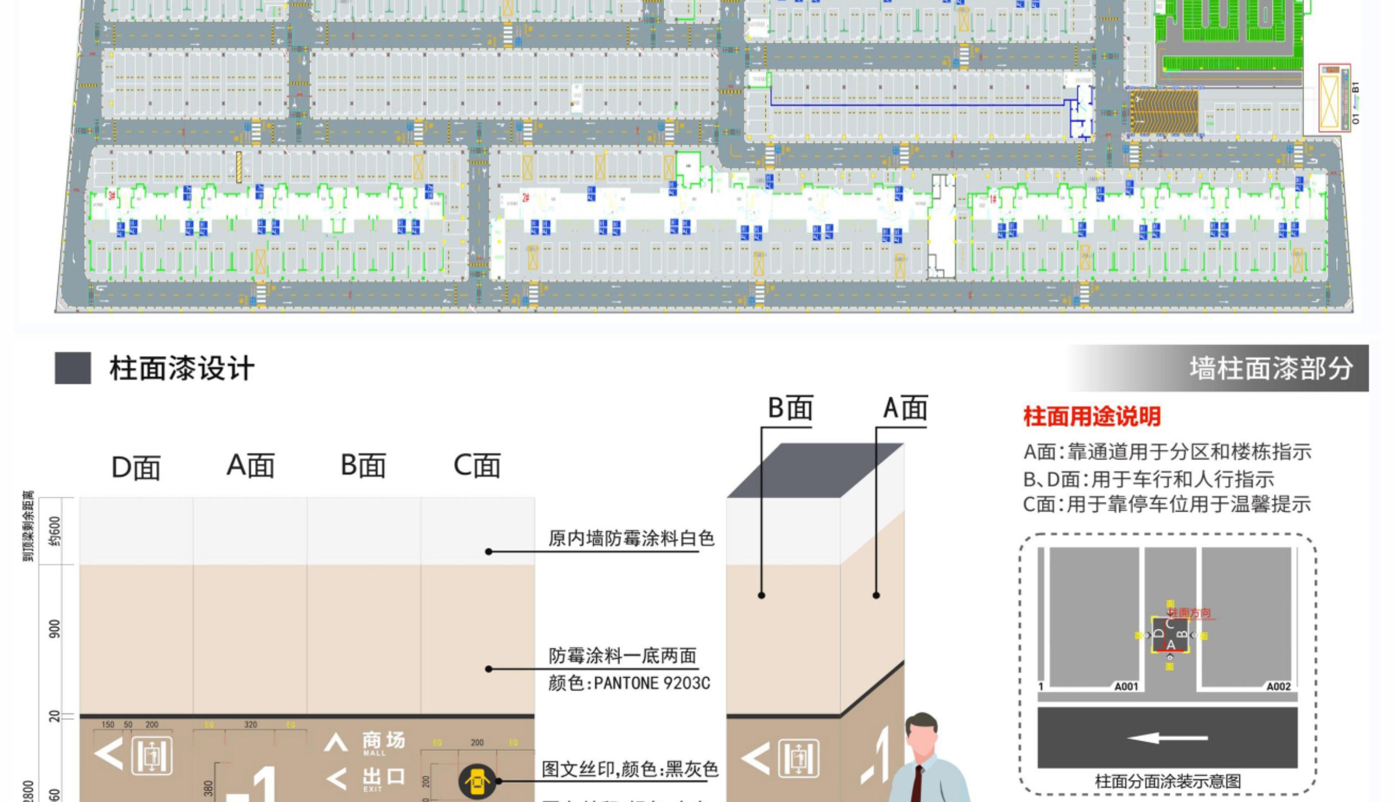 主要對車庫原建筑平面圖進行二次深化設計,包含停車場設計說明、施工工藝,常用交通設施工藝大樣圖及地坪漆施工圖,顏色搭配、分區(qū)范圍,墻柱面漆施工范圍,加上一般的墻柱面文字圖案等標識指引設計,工程量計算等,讓項目達到能施工和報價的目的。