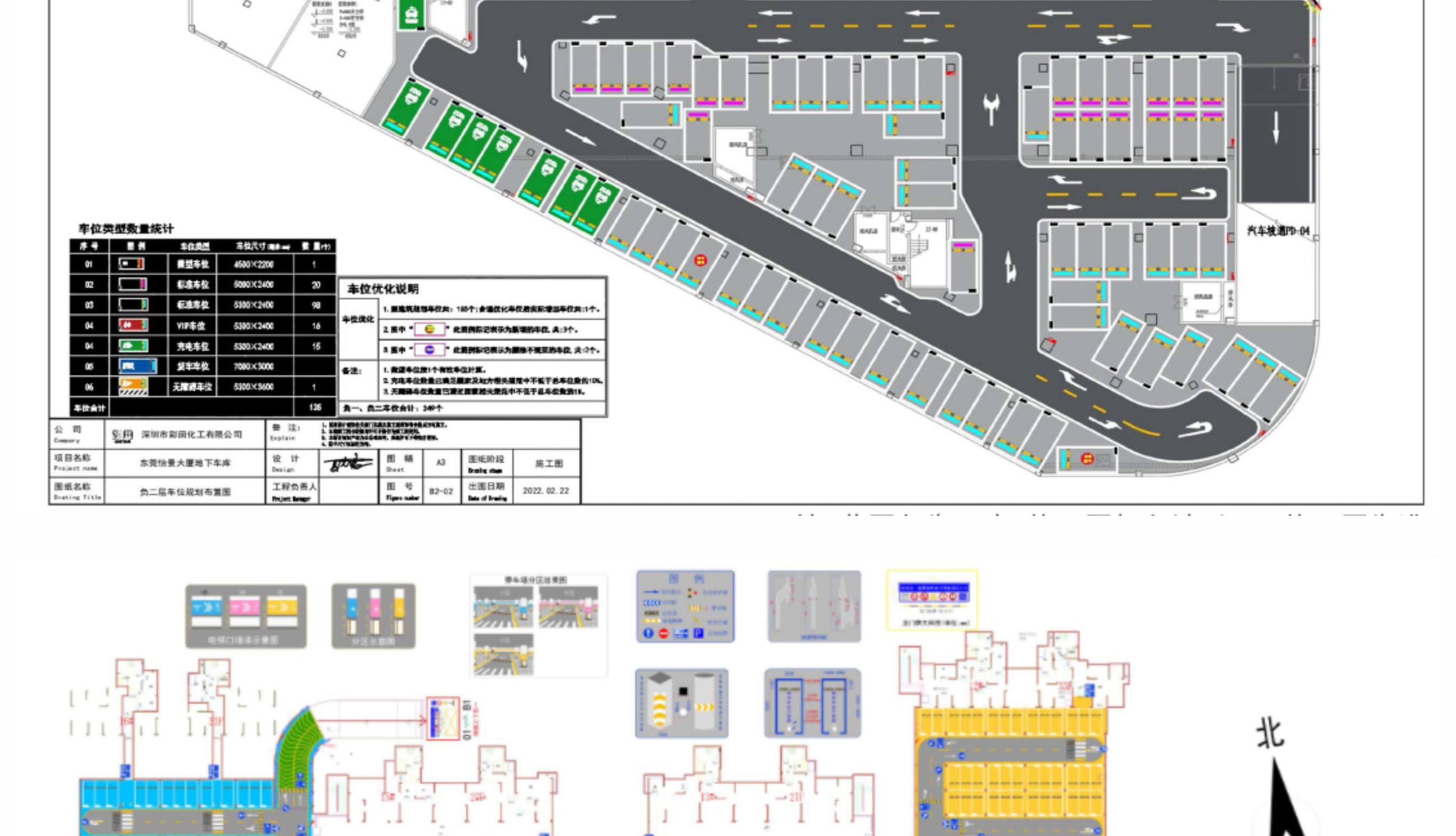 CAD深化施工圖介紹:主要對車庫原建筑平面圖進行二次深化設計,包含停車場設計說明、施工工藝,常用交通設施工藝大樣圖及地坪漆施工圖,顏色搭配、分區(qū)范圍,墻柱面漆施工范圍,加上一般的墻柱面文字圖案等標識指引設計,工程量計算等,讓項目達到能施工和報價的目的。以彩田化工的地下車庫平面圖為例,深化施工圖的深化設計如下:CAD平面施工圖深化設計包含內容:1.車庫交通組織動線規(guī)劃,動線分析;2.地面標線部分、通道線...